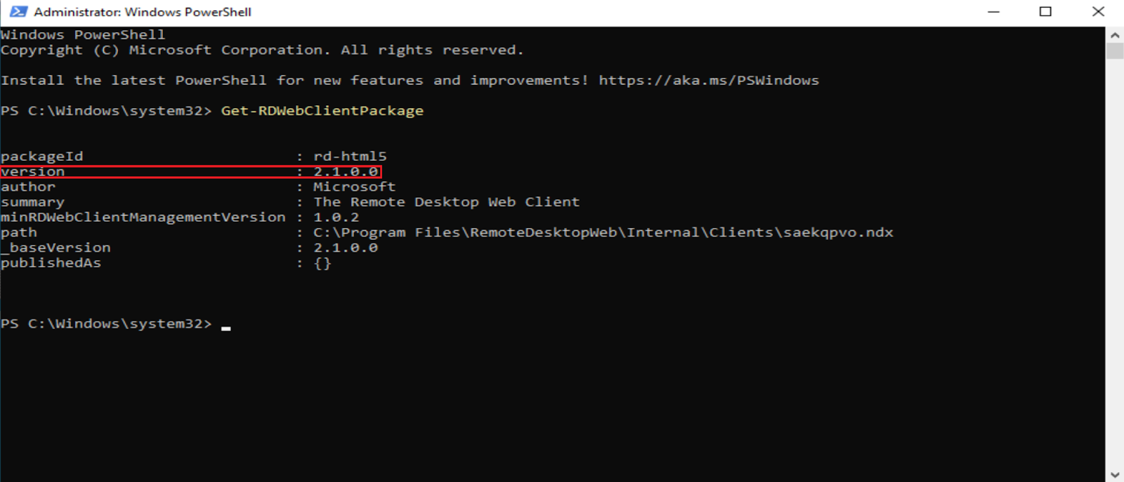 3. Po wykonaniu polecenia zostaną wyświetlone szczegółowe informacje o programie Remote Desktop Web Client, w tym parametr Version wskazujący wersję programu Web Client zainstalowaną w systemie.